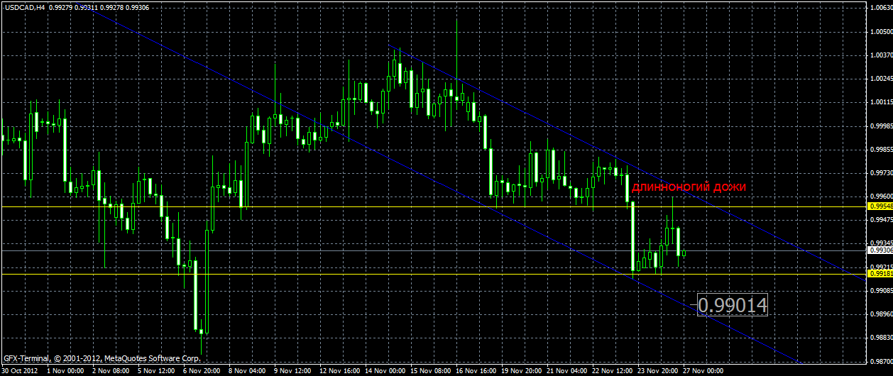 Свечной патерн "длинноногий дожи" , а за ним еще и медвежье подтверждение отрабатывают "юга". Пробив важный уровень сопротивления в районе отм.0.99548 цена ринулась обновлять новые низы.На уровне отметки 0.9918 прикрыл свой шорт,но тем не менее пара находится под давлением и если медведям удастся продавить котировки через уровень 0.99181,то целью будет служить уже граница канала в районе отм.0.99014.