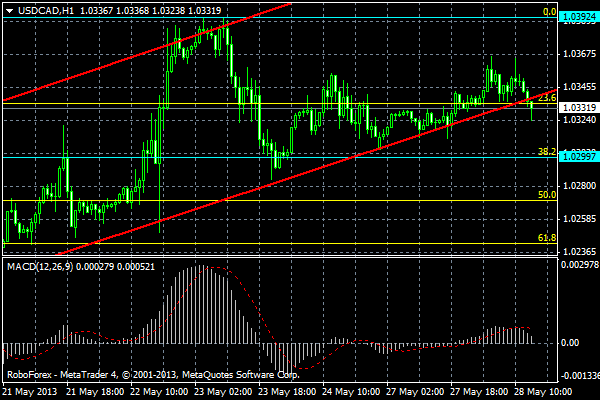 Валютная пара USD/CAD движется в рамках восходящего канала 4-хчасового графика. Цена так и не дошла до линии сопротивления канала и направилась вниз, поэтому предпочтительны продажи по паре с целью на уровне 1,0325, что соответствует уровню 23,6% по Фибоначчи. Также сигналом к снижению послужила дивергенция, образовавшаяся на данном графике. Прикрепленные файлы: