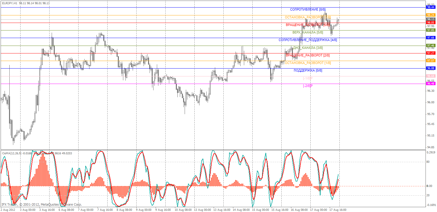На часовом графике пара находиться на уровне мюррея 6/8 (98,05). Вероятно пара продолжит свой рост к уровню мюррея 8/8 (98,44) - +1/8(98,63), на это указывает рост стохастика. От данного диапазона 98,44 - 98,63 наиболее вероятен откат вниз.