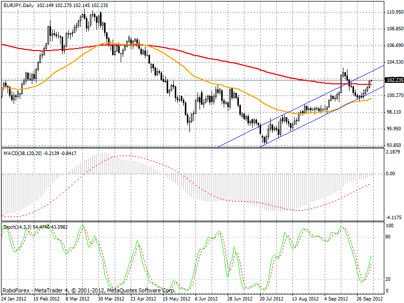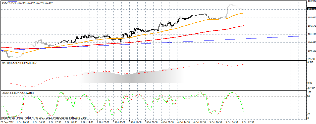 Пара сильно рванула на север, цена уже около 102 фигуры, похоже северный тренд продолжается, я пока жду коррекцию для входа в длинную позицию, думаю основная цель быков находится около максимума месяца 103.50. ![]() | ||||