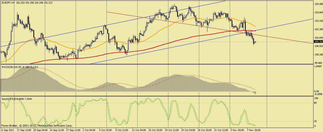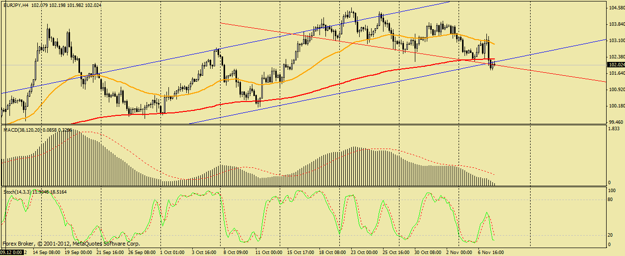 На дневном графике произошел прорыв синей скользящей аллигатора, что дало сигнал об изменении основного тренда, на 4 часовом тайм фрейме хорошо виден пробой среднесрочной поддержки 102.24 который сигнализирует об начале снижения на юг. ![]() | ||||