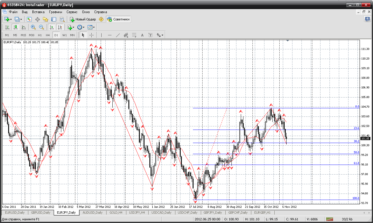 Глянул пару на выходных: интересная ситуация складывается. На дневке, в принципе пара развернулась вверх (94.11 - 104.58) и идет такой приличный откат. Внизу имеем серьезный психологический уровень 100 йен за еврика. Но в тот район не пускает 38.2% откат от движения вверх. Это примерно 100.55, от которого отскочили в пятницу. Я уже начал покупки от 100.71, при подходе к 100 добавлю, ниже пойдет - еще добавлю. Чувствуется, на этой паре можно хорошо заработать.... Прикрепленные файлы: