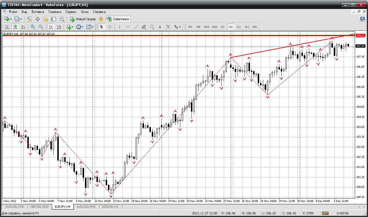 Честно говоря по eur/jpy у меня идет больше южных сигналов нежели северных, стоить только обратить внимание на смещения уровня сопротивления с 107.93 к 107.79, также около 107.79 произошло формирование 4 верхних фракталов, сигналом на продажу станет прорыв скользящих аллигатора. ![]() | ||||