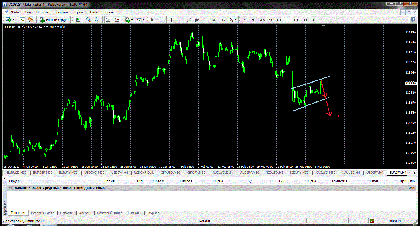 Как видно на графике цена вышла из линий низходящего канала. Теперь стоит ожидать небольшого подъёма и тестирования 121.71 после чего открывать ся в южном направлении с целью на уровне 119.63 ![]() | ||||