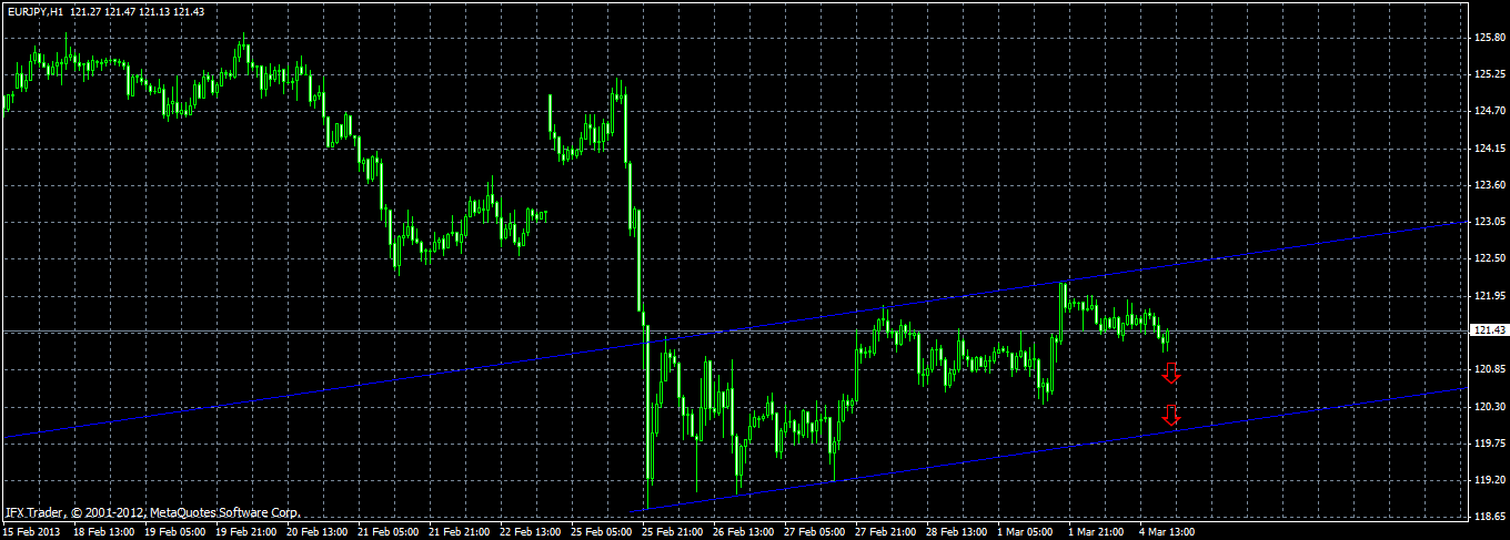 Честно говоря eur/jpy как то больше смотрится в южном направлении, на дневном графике четко видна горизонтальная линия сопротивления 122.00 фигура- выше нее пару не пускают, сейчас идет формирования нового южного тренда и нужно ожидать завершения данной коррекционной волны ,на 4 часовом графике RSI подал сигнал на продажу, первая моя цель- отметка 120.00. |