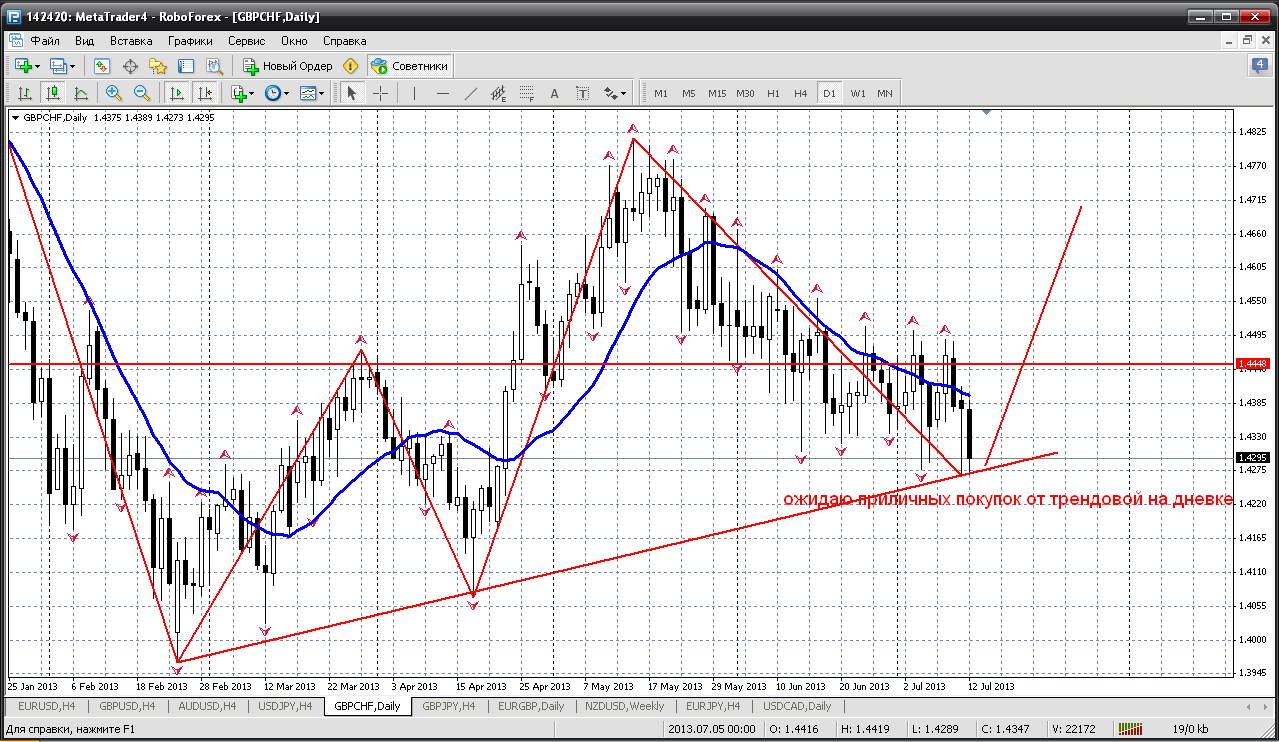 Фунт франк на прошедшей дважды протестировал трендовую на дневке. Все таки остаюсь при своем мнении, что от этого уровня надо покупать. Даже если покупки от 1.4267 не будут профитными, пипсов через 150 добавлю еще на бай. В целом прибыль будет однозначно. Цель вплоть до 1.50. Как то так. Прикрепленные файлы: