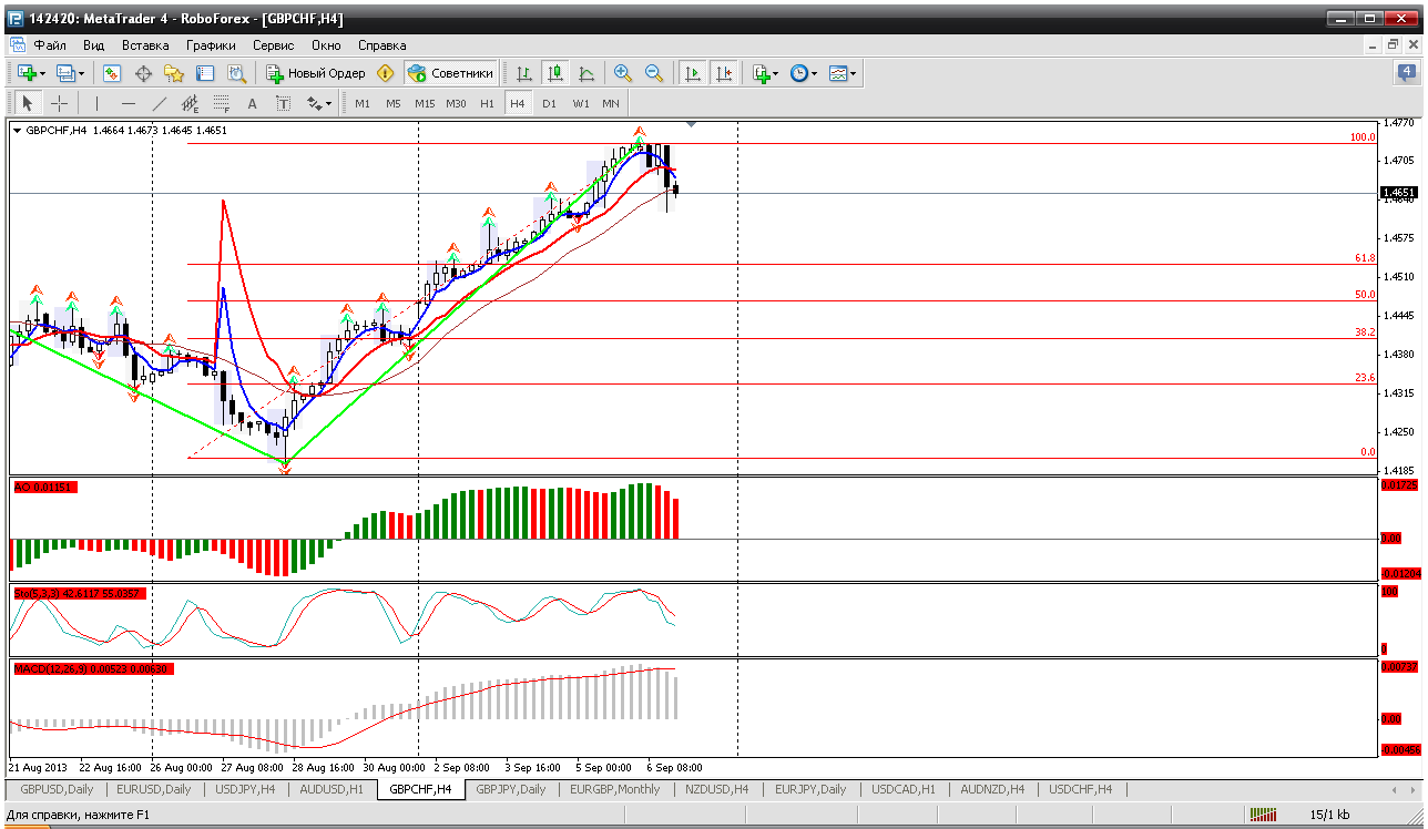 По паре GBP\CHF на данный момент торговля ведется выше скользящих средних линий. дополнительный индикатор ниже нулевой линии с показанием на повышение а основной индикатор дает сигнал на покупку рекомендую покупать при пробитии линии 1.4686 до линии сопротивления 1.4713 стоп лосс установить у линии поддержки 1.4677.