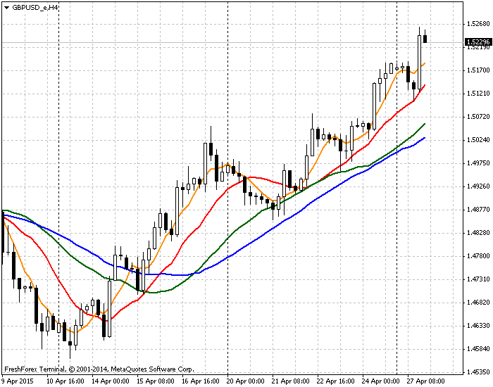 Торговля по 4-м мувингам. Нечто похожее на аллигатор. Периоды мувингов в принципе не важны, главное чтобы были разного периода. Торгуем в сторону тренда, как говорят: "тренд мой друг"). | ||||