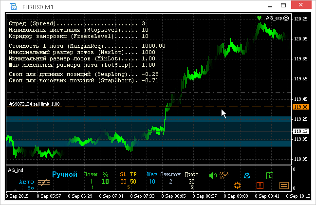 - Отображение торговых условий: зона StopLevel, коридор заморозки, сводка торговых условий прямо на графике.