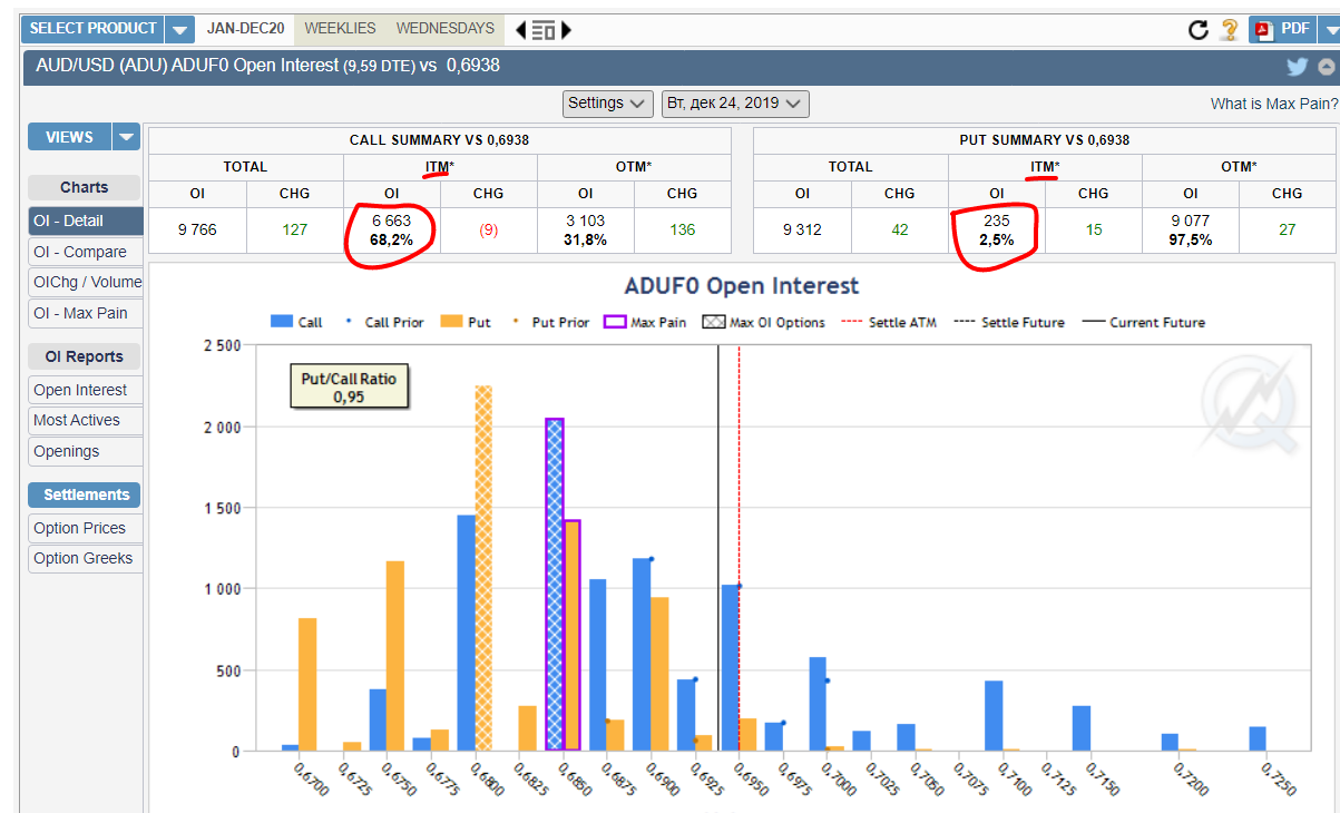 Идея опционного анализа заключается в том, что продавцами опционов являются, по большей части, крупные игроки рынка. По моим наблюдениям так происходит в 80% случаев. Нежелание выпускать опционы в деньги и формирует уровни. Третьего января будет месячная экспирация (принудительное закрытие позиций) опционов на фьючерсы мажорных валют. Посмотрим в каком состоянии некоторые из них. На гистограмме аббревиатура ITM означает-опционы в деньгах, соответственно ОТМ- опционы вне денег. По евро: в деньгах 16.5% коллов и 17% путов. По фунту: в деньгах 10.3% коллов и 15% путов. По австралийцу: в деньгах 68.2% коллов и 2.5% путов. Кто-то скажет:"Ага, вон сколько коллов в деньгах, значит анализ не верен". Ну во-первых, вполне возможно, что мы не правы предполагая, что опционы продали "сильные руки", бывает и такое, но редко, а во вторых я предполагаю, что цену должны опустить до 3-го января хотя бы выйти на коллы в деньгах на 37,5%. Тогда будет по коллам в деньгах плюс по путам в деньгах будет 40%, а в общем из 200% опционов (100% колл и !00% пут) будет 40% в убытках, что вполне устроит продавцов опционов. Прикрепленные файлы: