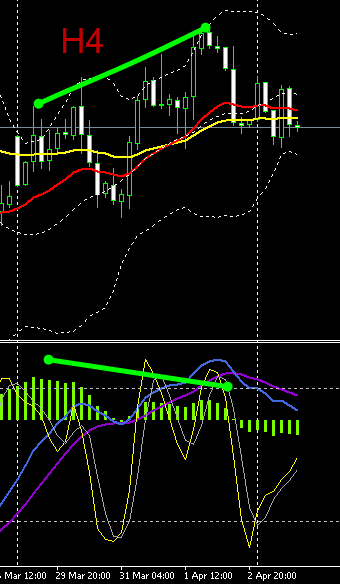 Н4. На четырехчасовом графике мое внимание привлекла хорошо сформировавшаяся дивергенция MACD гистаграммы, это хороший сигнал к развороту, и играть на повышение уже нет смысла, но и продавать еще рановато. Ждем прояснения ситуации. Н1. Отличным подтверждением завершения бычьего тренда на часовом гр. является яркая дивергенция RVI, также хочу заметить, что силы быков очень быстро упали, и они не смогли протестировать сопротивление, готовность продавать номер один. Ждем развития Прикрепленные файлы: