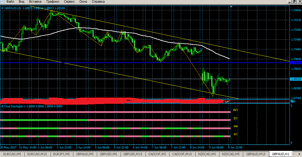 8. Выход с рынка: или когда доходит до линии прочерченным по зигзагу или закрываем по смену направления стохастика ( обычно использую для Н4)