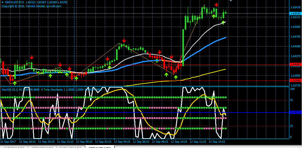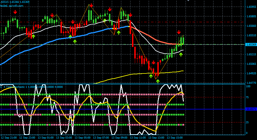 торговал по ней на бай. Так как тренд не менялся и остался восходящим, что показывает самая верхняя линия на 4 тайм стохастик. В таких ситуациях я жду отбоя от средней линии при условии, что крос алерт и стохастик будут показывать восходящий тренд. Так в принципи и произошло, что привело к прибыли. Выожу строго по рыночному показателю стохастика при пересечении белой линии жёлтую. Не стоит вечно надеяться если тренд ещё не сменился то пусть будет откат и я его пережду. Мы забираем свой профит и всё! Пока головой не пробьёшь все котировки трейдером тебе не стать!