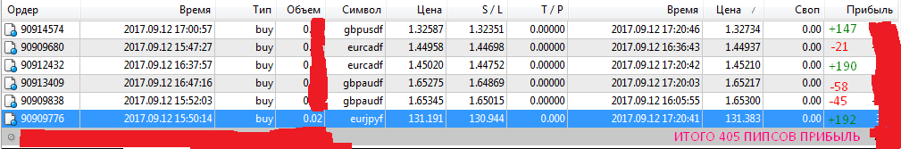 Я не ожидал пока у меня выбьет стоп лос. Когда индикатор показывает, что нужно закрывать я закрываю. Вход строго по стратегии не какой самодеятельности. Если вхожу по М5 и тренд удачно складывается с М15, то можно ожидать дальнейшего движения. В случае если происходит обратно - то выходим по М5. Выходить нужно быстро. Вход строго только после сформировавшейся свечи М15. Итоги торговли сегодняшнего дня я выкладываю. В случае, если кто то хочет сказать что намалевал, то можете взять калькулятор и сами посчитать, как это делал я. Итог сегоднешнего дня +405 пипсов. Да! не дотянул я до своих желаемых +500, но не расстраиваюсь. Тоже более мение не плохой результат. ПЛАНЫ НА ЗАВТРА Я ТОРГУЮ на этом счёте у брокера с небольшим спредом, которого долго выбирал. Завтра же я буду торговать у двух других брокеров у которых спред в 2, а то и 3 раза больше. Интересно самому как же повлияет спред на получаемую мною прибыль. Данный счёт, что я выложил завтра на нём торговли не будет. Тестировать буду парочку дней так как считаю, что спред "сожрёт" половину моей прибыли на этом счёте, но опробовать необходимо. Прикрепленные файлы: