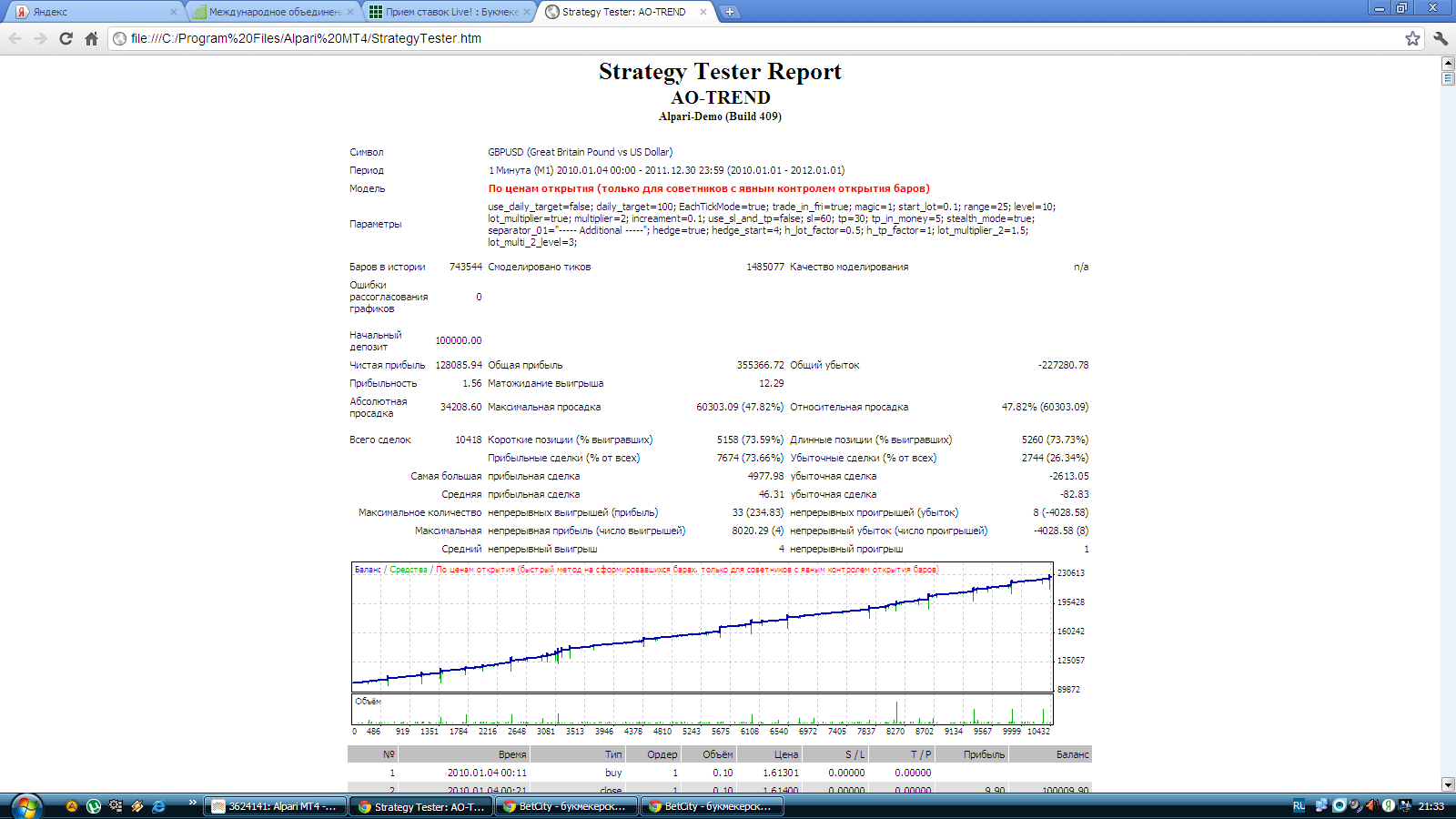 Если не секрет откуда этот советник? В интернете практически нет информации о нем, только сайт где его продают и только один где его обсуждают. Причем при прогонах на демо счетах у всех идет прибыль, при постановке на центовые реальные счета у всех одни минусы. С форума одного стыбрил... Он у меня не долго стоял с неделю выводил в + но просадки покозались великоваты может как то оптимизировать но сложновато. | ||||||