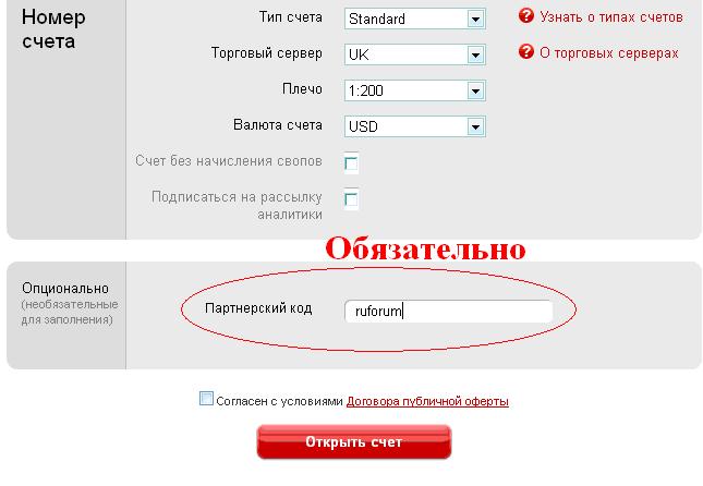6. Счет на InstaForex, указанный для начисления бонуса должен быть зарегистрирован по партнерской ссылке Руфорума с указанием метки ruforum при регистрации (в графу «Партнерский код»).