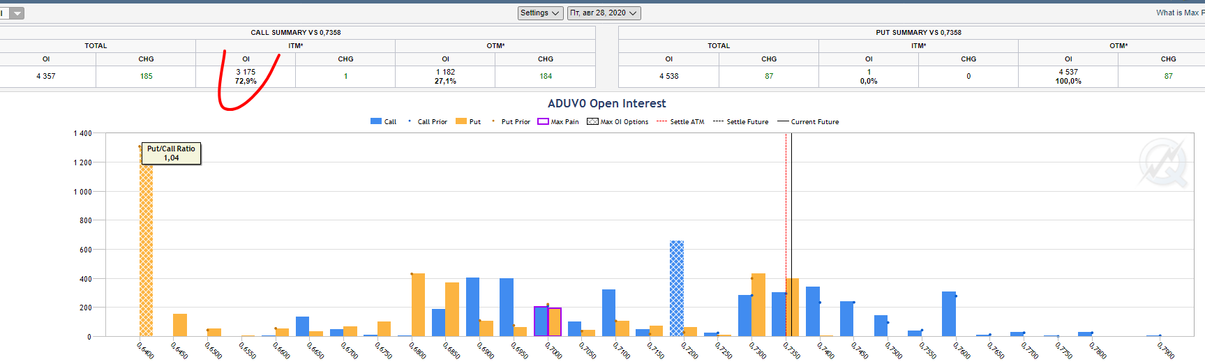 Новый месячный контракт начнётся с 6-го сентября, но можно предварительно посмотреть что там. А там более реальная картина, по низу наибольший открытый интерес на страйке 0.6400. По верхам страйк 0.7200 в деньгах, тащить вверх его сложно. Наливают контракты на страйк 0.7400, можно допустить поход туда, а вот 0.7600 мне кажется далековатым, но посмотрим. В деньгах коллов много, 72.9%.