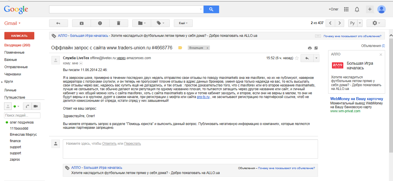 при выборе брокера не в коем случае не смотрите форум отзывов на мофте, ибо там запретили, и перестали печатать плохие отзывы, о своих брокерах партнёрах, прикрепляю файл, где я пожаловался в мофт и мне пришёл ответ. |