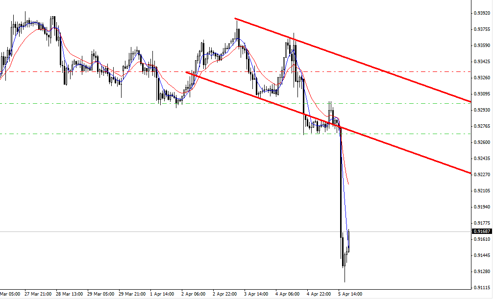 Можно заметить, что пара понемногу отходит от мощного рывка вверх и понемногу идет движение на понижение. В данный момент курс находится ближе к нижней границе канала, однако я обращаю основное внимание на волнообразное движение канала. Так что советую всем смотреть в продажи вплоть до уровня 0.9150, но тем не менее не забывать ловить откаты в 30-40 пунктов. |