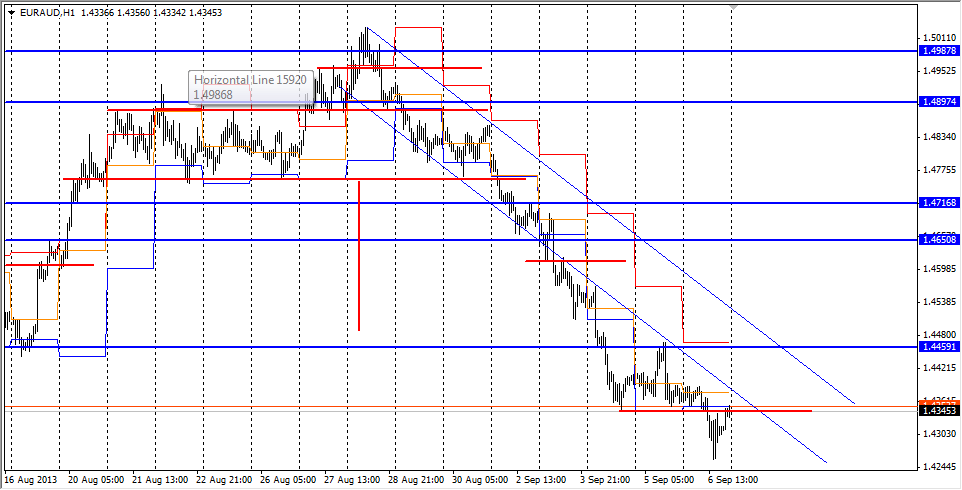 По паре EURAUD на часовом графике все по плану пара подходит к раз воротной точке к уровню 1,4210-1,4180 откуда можно купить пару с целью коррекции на уровень 1,4320,считаю что большее на этой недели не произойдет, пока все указывает что евро так и будет падать против остального рынка.Стоп на уровень 1,4100