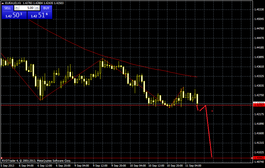По паре EURAUD на часовом графике два сценария снижения,первый уровень 1,4295 примерно от него пара может развернуться и пойти вверх по новому тренду или упасть более глубже к уровню 1,4220-1,4180 откуда так же считаю можно купить, цель вверху будет на уровне 1,4420 первая.Стоп можно поставить на уровень 1,4150