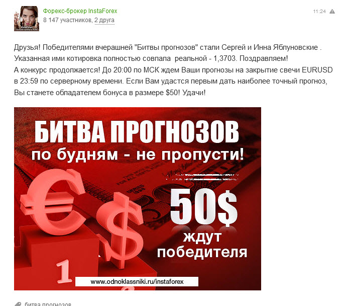можете поздравить))) в конкурсе от ИнстаФорекс "битва прогнозов" в Однокласниках выиграл $50! Угадал закрытие дневной свечи пункт в пункт)) правда пришлось под бонус новый счет открывать- так как только на конкурсный начисляют. Бонус не снимается и не отыгрывается но прибыль выводиться без ограничений. Так как бонуса всего $50 то под него открыл центовый счет - мне маленькими суммами на центовике торговать комфортней)) Условия конкурса можно узнать в группах ИнстаФорекс на Фейсбуке, Однокласниках или вКонтакте (кажется и в твиттере есть этот конкурс- точно не знаю) первым делом, первым делом это стопы... ну а профиты? а профиты потом!