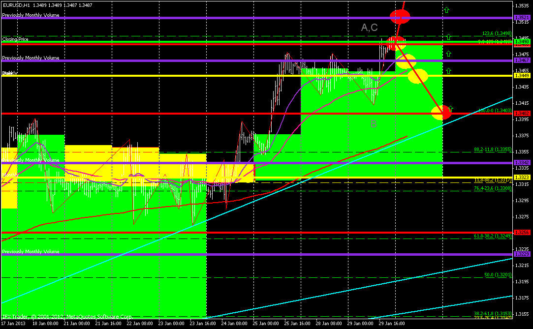 В понедельник торги прошли была в узком ценовом диапозоне пара пробыла во флете! Вырости и упать так и не смогла! В моём прогнозе на 30.1.2013 предполагаю завершение восходящего движения 1,3470 и за тем разворот в направлении 1,3413 и ниже к 1,3400! Ближайшим уровнем сопротивления является 1.3489! Ближайшие уровни поддержки 1.3427 и 1.3398! Редактировалось: 1 раз (Последний: 29 января 2013 в 18:29) | ||||