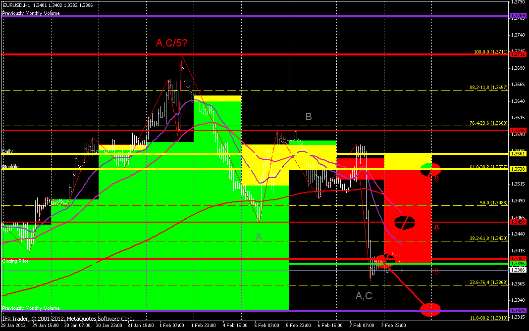 По евро-доллару падение думаю завершится в районе 1,3350 и ишимоку тоже на этот уровень показывает, на уровне 1,3353 расположен Киджун, который и может послужить поддержкой текущему нисходящему движению. Правда вся текущая нисходящая коррекция может продолжаться еще и до 1,3290 где на викли расположено верхняя грань облако, так что о завершении нисходящего хода поговорим при достижении этих целей, а пока - на юг.