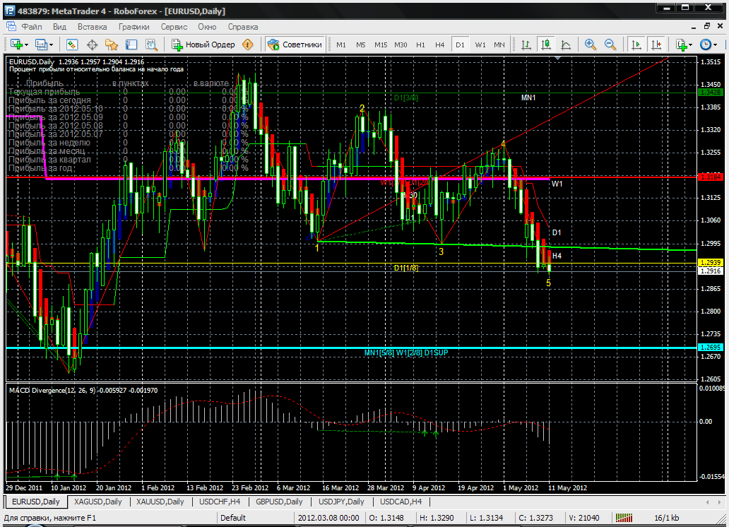 по h4 пара на данный момент тестирует уровень -1,2939(1/8)/. в случае пробоя данного уровня ожидаю снижение пары , судя по d1 - 1.2695 (1/8).индикатор macd находится в отрицательной зоне. Прикрепленные файлы: