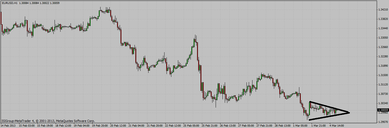 "Симметричный тругольник" образовавшийся на часовом таймфере в данном случае служит фигурой продолжения тренда и ожидаю снижение котировок в район уровня сопротивления на отметки 1.2850. |