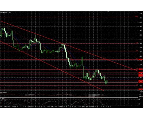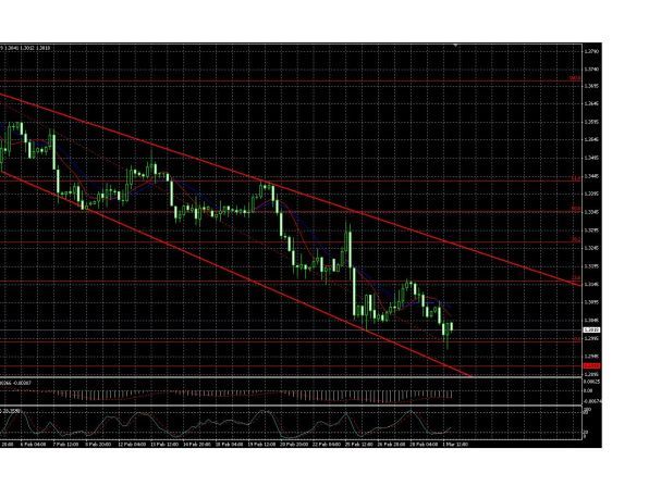 На данный момент курс находится в нижней части канала Боллинджера и отчетливо просматривается нисходящий тренд. Лично я пока что могу предложить лишь дальнейшее понижение курса, так как ни один из моих индикаторов не дает предпосылок для сигналов на повышение. В качестве цели советую использовать 1.2945. |