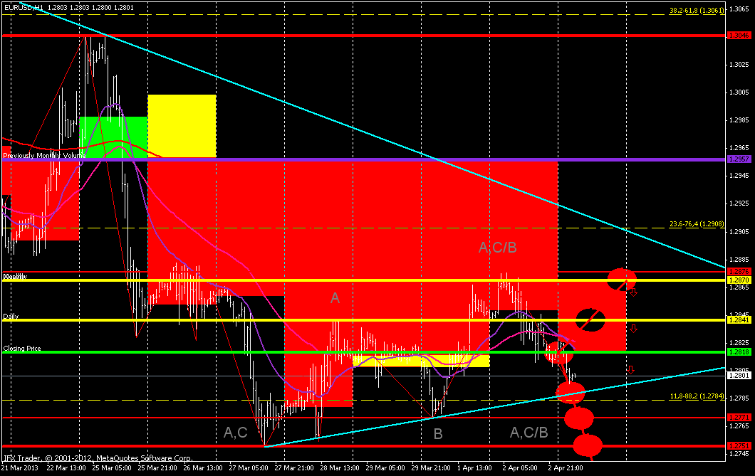 Предполагаю что будет масивное снижение цены, до 1.2765. В противном случаи разворот до 1.2845..