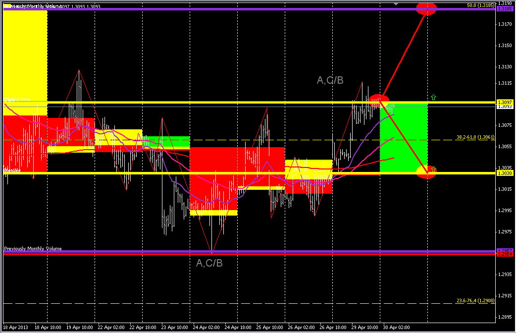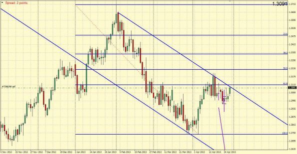 доброго времени суток, господа. После пятничного и сегодняшнего роста пара оттолкнулась от уровня 1,3099 ( наклонное сопротивление на Н1.)и начала нисходящее движение . На графике четко видны две вершины , так как рынок повторяется - ожидаю дальнейшее снижение пары от второй вершины (1,3099) к уровню 1,3006(зона 1)