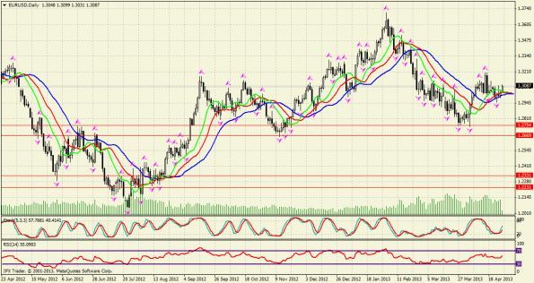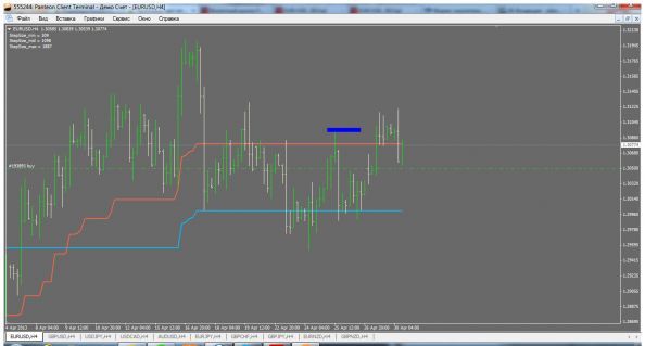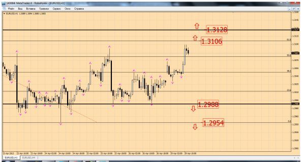 Пара евро доллар сегодня смогла пробить уровень месячного сопротивления в цене 1.3050 и пошла выше к уровню сопротивления в цене 1.3079 и этот уровень пара смогла пробить и сейчас торгуется в цене 1.3095, думаю что пара пойдет тестировать уровень сопротивления в цене 1.3111.