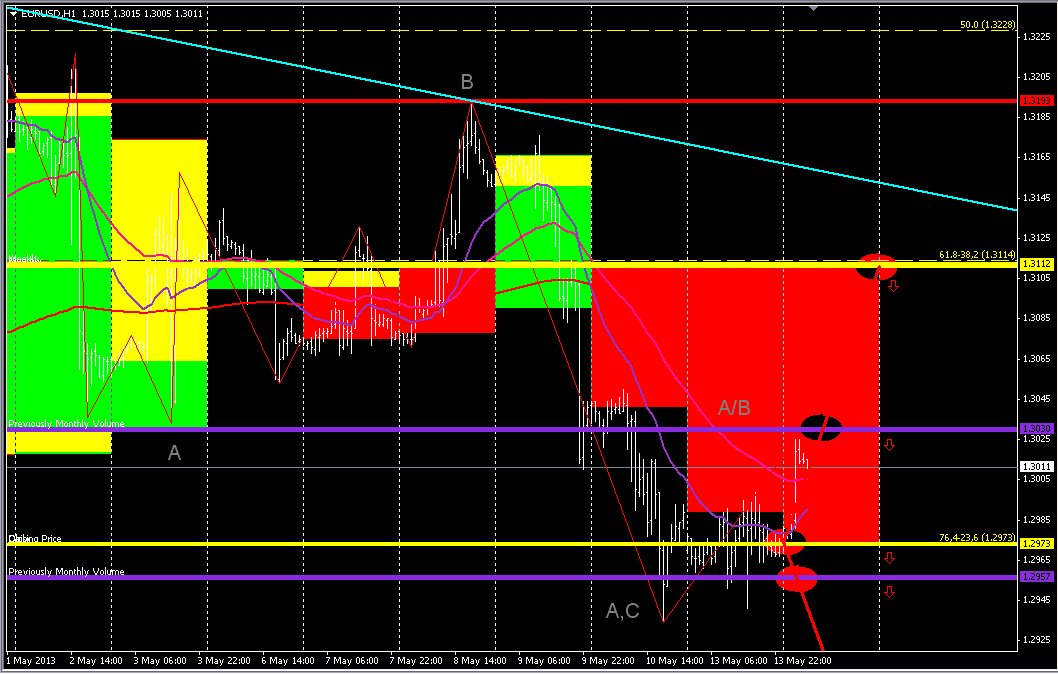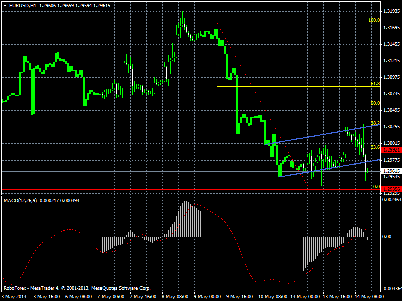 Валютная пара выполнила необходимый уровень коррекции на часовом графике и продолжила свое падение. Прогнозирую снижение к уровню 1,2935 и дальнейшее обновление минимумов. Гистограмма MACD переходит в отрицательную зону и также указывает на предпочтение продаж. Редактировалось: 1 раз (Последний: 14 мая 2013 в 15:15) |