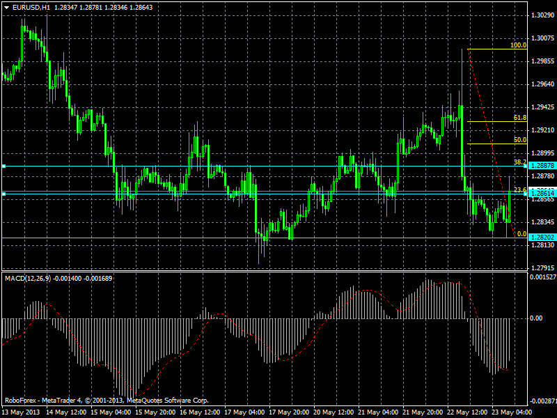 Мой аналитический прогноз по валютной паре EUR/USD на 23 мая. Пара евро доллар продолжила сегодня коррекцию как я предполагал в прошлом прогнозе. И на хороших новостях по США резко пошла ни снижение. На завтра целью рассматриваем уровень на пробой и перекрытие 1.2901.(23.6%уровень фибоначи) максимумом по от этой коррекции буду ожидать 1.2928. Далее основным буду рассматривать дальнейшее снижение к уровню 1.2865 ![]() | ||||