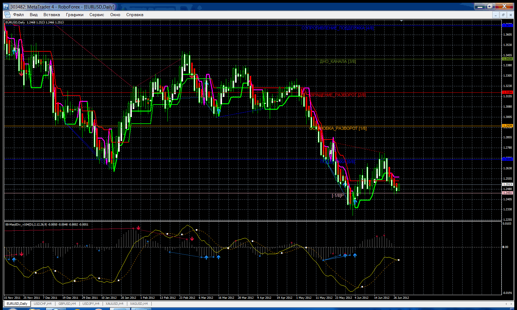 на мой взгляд на данный момент по паре идет коррекция , с дальнейшей целью пробоя уровня -1/8. индикатор macd находится в отрицательной зоне. ожидаю возможный подьем до уровня -1.2540, а затем дальнейшее понижение. Прикрепленные файлы:
