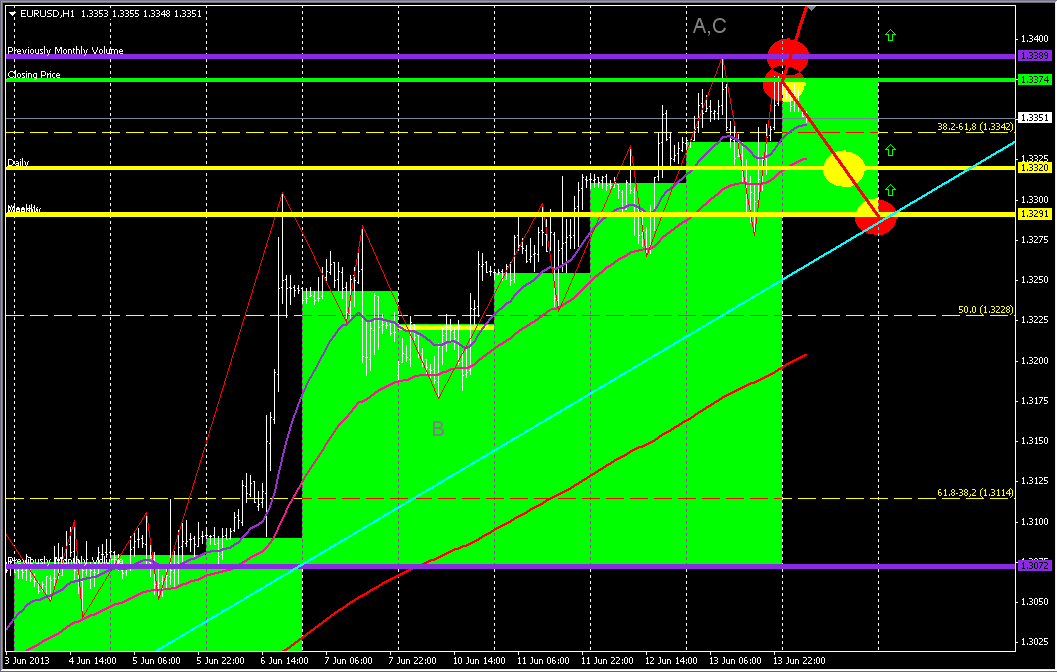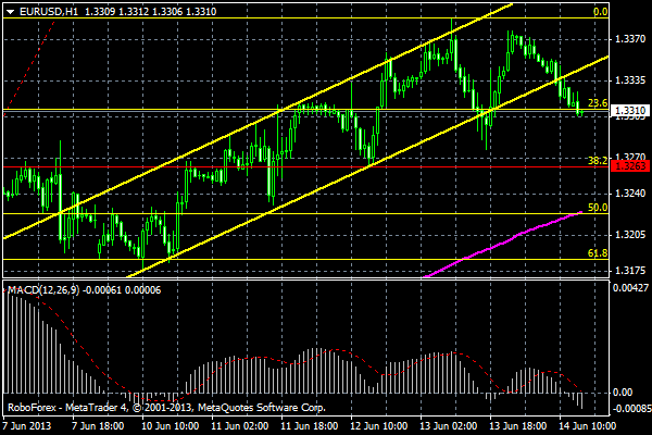 Всем привет. Валютная пара EURUSD на часовом графике оттолкнулась от сильного уровня сопротивления 1.3359 и на данный момент понемногу движется в южном направлении. На индикаторе МАКД виден сильный сигнал для продолжения движения на юг – дивергенция(обозначил красными линиями). Ожидаю дальнейшее снижение пары к уровню 1.3289(38.2 по Фибоначи). Побольше профитных сделок!