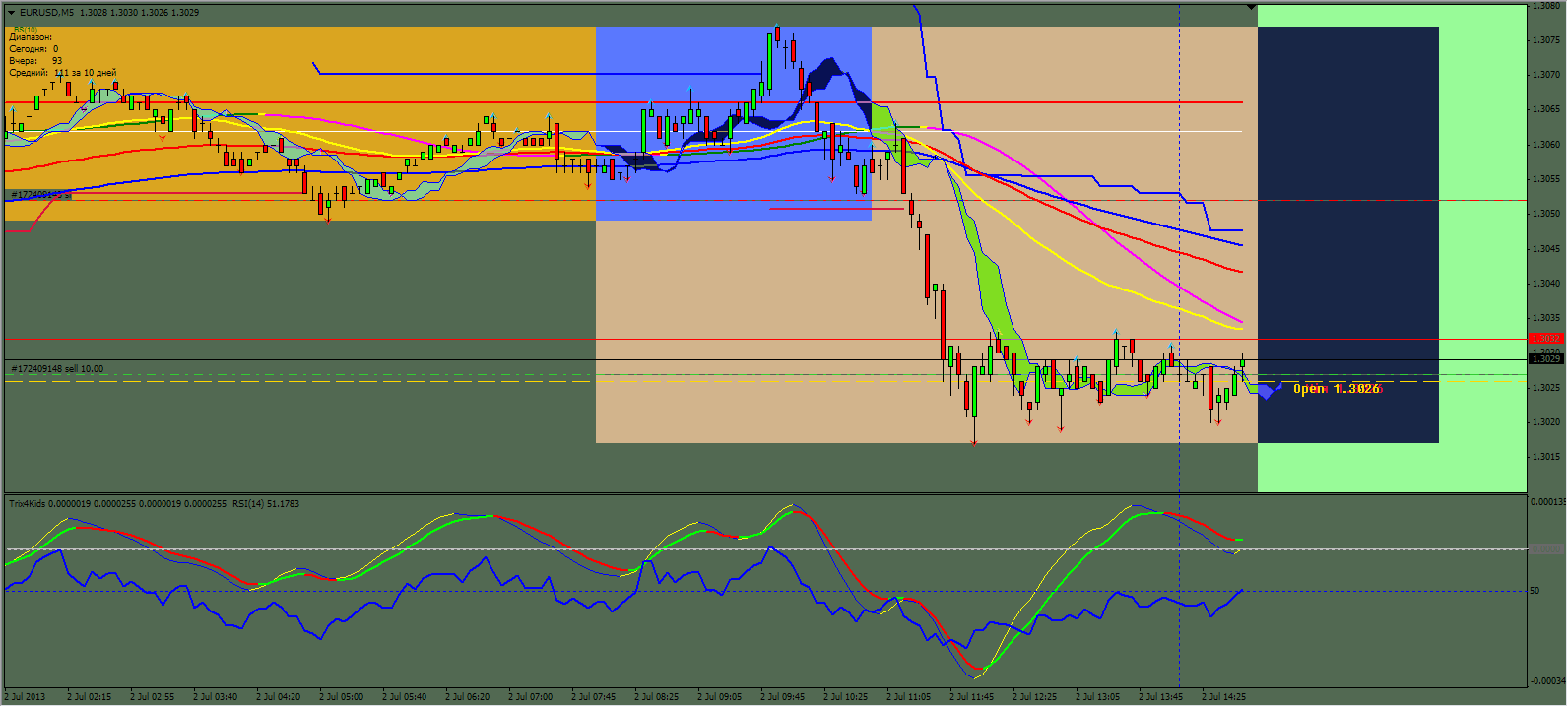 Пара закрепилась внутри облако индикатора.Благодаря полученному сигналу от дополнительного индикатора и показании линии облако индикатора рассматриваю только покупки при закреплении цены выше уровня средней линии облако на 1,3013 сдвижением цены до уровня верхней линии облако на 1,3048.Стоп лосс на уровне 1,3000.