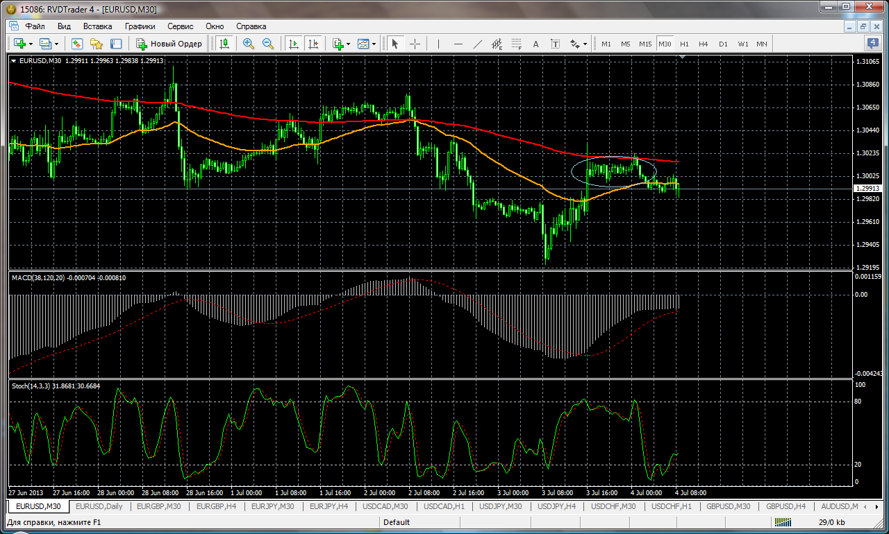 На часовом графике отлично виден отбой от зоны сильного сопротивления 2985 (зона 3 верхних фракталов+ здесь проходят скользящие аллигатора), пара опять начала возобновлять основной южный тренд , стохастик образовал сигнал на продажу, цель скорей всего будет 2900 фигура. ![]() | ||||||