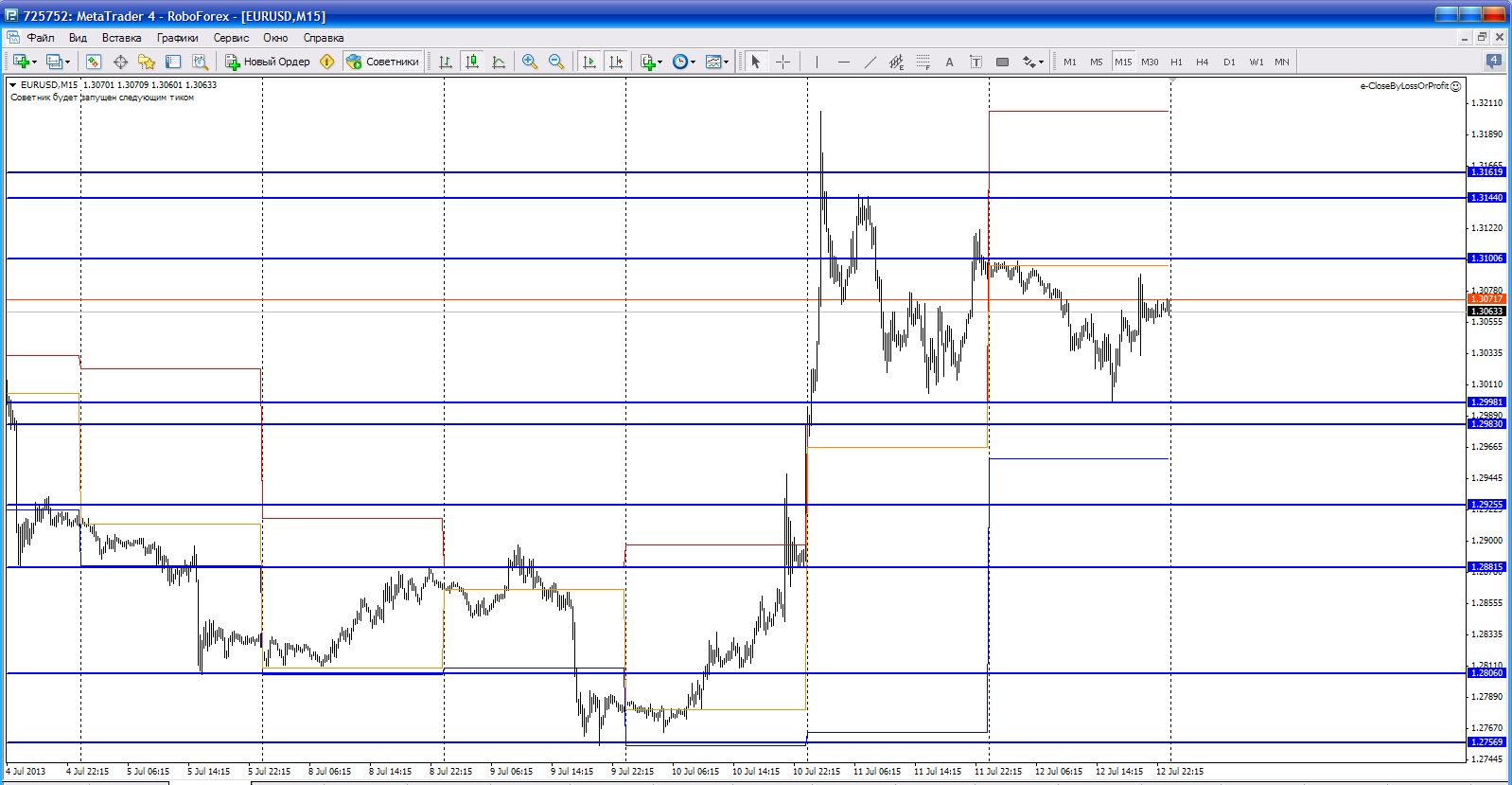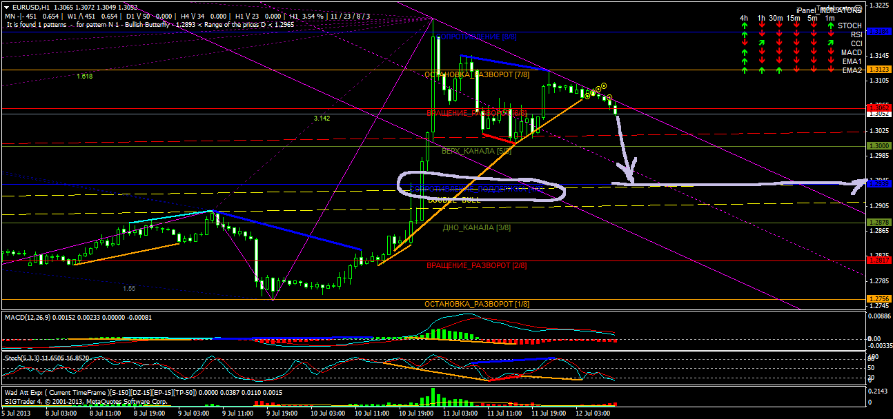 Доброго времени суток. Пара Eur/Usd отбилась от верхней границы наклонного канала на Н1 1,3075 и начала снижение к нижней границе канала 1,2975. На сегодня ожидаю прорыв нижней границы, поэтому открыл позиции на сел.