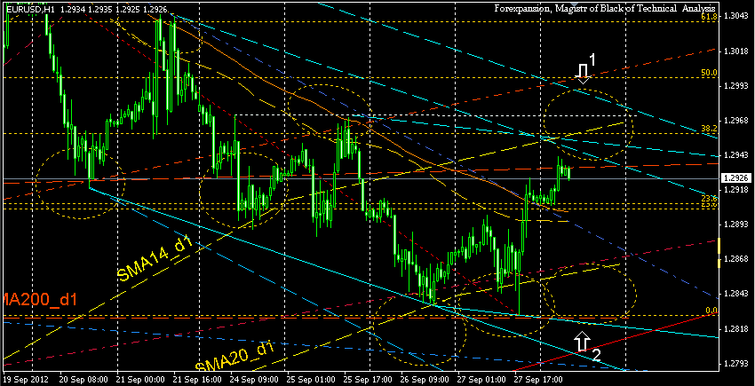 - 38% уровнем коррекции Фибоначчи от снижения 17 – 27 сентября - параллельной проекцией через вершину 17 сентября - параллельной проекцией через вершину 21 сентября - параллельной проекцией через вершину 25 сентября - уровнем от максимумов 24 и 25 сентября - мувингом SMA14_d1 (рис.1 поз.1). Облако поддержки образовано: - нисходящим уровнем поддержки по минимумам 26 и 27 сентября, - скользящими средними SMA20_d1, SMA200_d1, - вчерашним минимумом (рис.1 поз.2). Прикрепленные файлы: