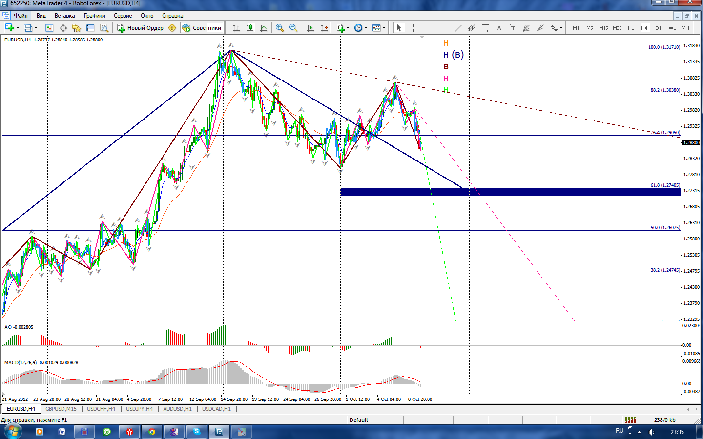 Пару мотает как г***о в проруби. В конце сентября (27-28 числа) пара легла всей грудью на бывшее сопротивление канала и даже моментами протестировала его,а дальше отскок.Сейчас мы наблюдаем "прорубку" уже основательную канала.(тф Д).При отскоке цены к уровню 200МА открою шорт.(тф М30) |