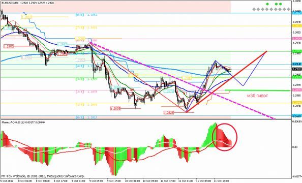 М30: продолжение формирование цикла вверх.Ожидаю коррекционную волну вниз в данном цикле к 1.2875(пивот м30),при пробои возможно продолжение консолидации вниз в ценовую зону(1.2845-1.2875),далее ожидаю третью волну вверх.