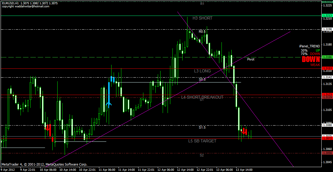 Прогноз пары EURUSD с 16.04.2012 по 20.04.2012, смотрим за уровнем 1.30. Пробой этого уровня вниз наведет пару EURUSD на 1.29 и ниже. Пока покупаем пару до 1.3150 и 1.32. Стопы размещаем ниже уровня 1.30. | ||||||