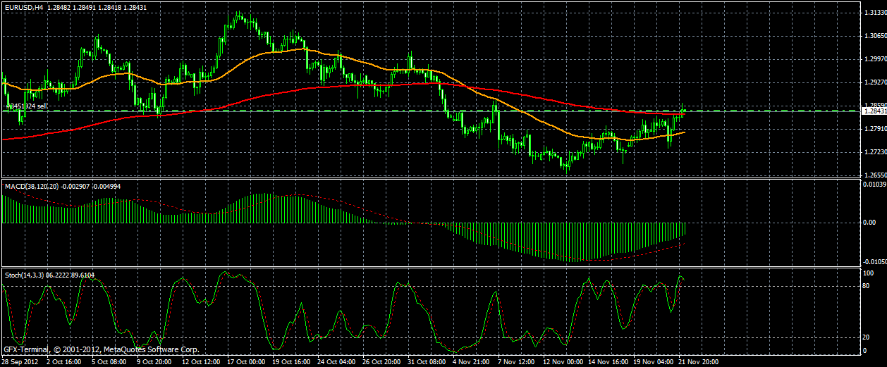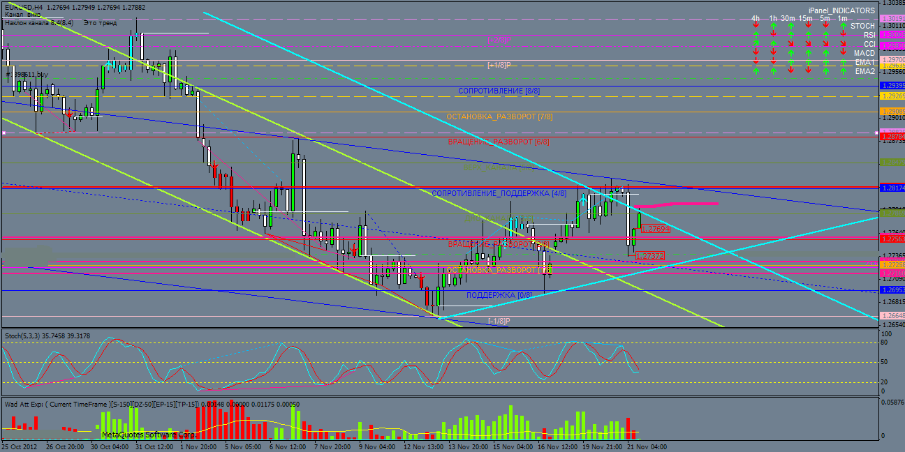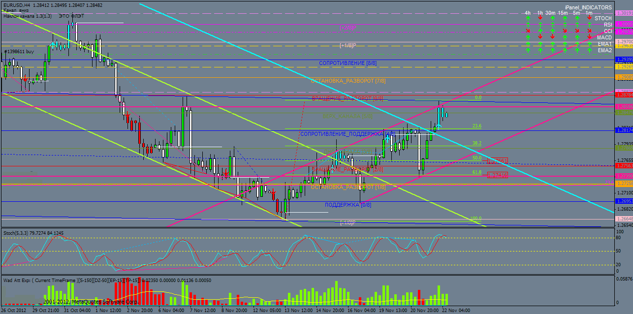 Находимся в середине торгового канала. Stoch RSI в зоне перекупленности и направленны вниз. Выше МА (100) цена не закрепилась. МА (42) и МА (28) направлены вниз. Наблюдаем паттерн «Пинцет с падающей звездой» - слабый разворотный сигнал. Резюме ПРОДОВАТЬ до уровня 1.2765. Поддержка 1.2810. ![]() ![]() Примечания: 1)Экспоненциальные скользящие средние: а) EМА (200) – зеленый толстый цвет б) EМА (100) – синий толстый цвет в) EМА (42) – синий тонкий цвет г) EМА (28) – красный тонкий цвет 2) Ценовой канал – светлого синего цвета 3) RSI с периодом 7 расположен под окном цены 4) Stoch (7, 3, 3) M30 и Stoch (12, 5, 5) Н4 под окном RSI 5) Дивергенция по Н4 фиолетового цвета Фундамент Важная экономическая новость по США в 17.30 – ожидаем укрепление доллара, с учетом вышеприведенного тех. анализа – прогноз ПРОДОВАТЬ пару. Редактировалось: 2 раз (Последний: 21 ноября 2012 в 14:51) :smile: