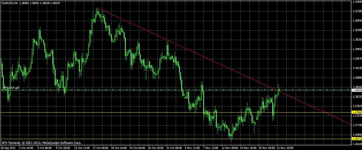 Данный рост пары с технической точки зрения, объяснения не находит. С другой стороны, известно, что Премьер-министр Греции Антонис Самарас вылетает (-ил) в четверг в Брюссель, с целью разблокировки международных кредитов ЕС и МВФ, посредством встречи с Жан-Клодом Юнкером ( премьер-министр Люксембурга (с 1995 года), министр финансов Люксембурга (1989—2009), глава Еврогруппы). Тем не менее, технически недельный ТМФ показывает приближение пары к верхнему нисходящему каналу. Дневной ТМФ показывает желательность совершения покупок по RSI. Внутридневной ТМФ ("Интрадей") Н4 свидетельствует об ослаблении силы быков. Опираясь на аналитику Владислава Антонова от компании Альпари, считаем пара двигается во флэтовом состоянии с максимум 1.2870 и по окончании «Дня Благодарения», силы «Быков» ослабнут. Вместе с тем, на фоне возможной инсайдерской информации по Евро-зоне, есть вероятность обновления максимума 1.2985. Рекомендации ПРОДАВАТЬ от уровня 1.2870.
