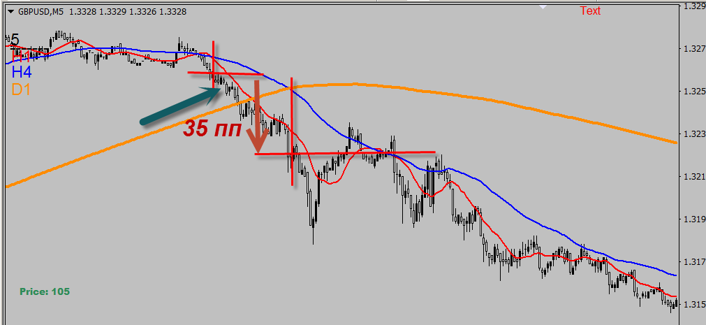 У меня на пятнадцатиминутном графике накинуты скользящие: четырехчасовая, дневная и недельная. Недельная для общего контроля на этом таймфрейме. И если даже входить по пересечению скользящих (4 часа и день) в точке 2, то получился бы неплохой результат. Но ведь вход можно сделать и по другим сигналам: локальные хаи понижаются, локальный лоу пробит (точка 1). Такой вход дает лучшие результаты на 20 - 30 пунктов.