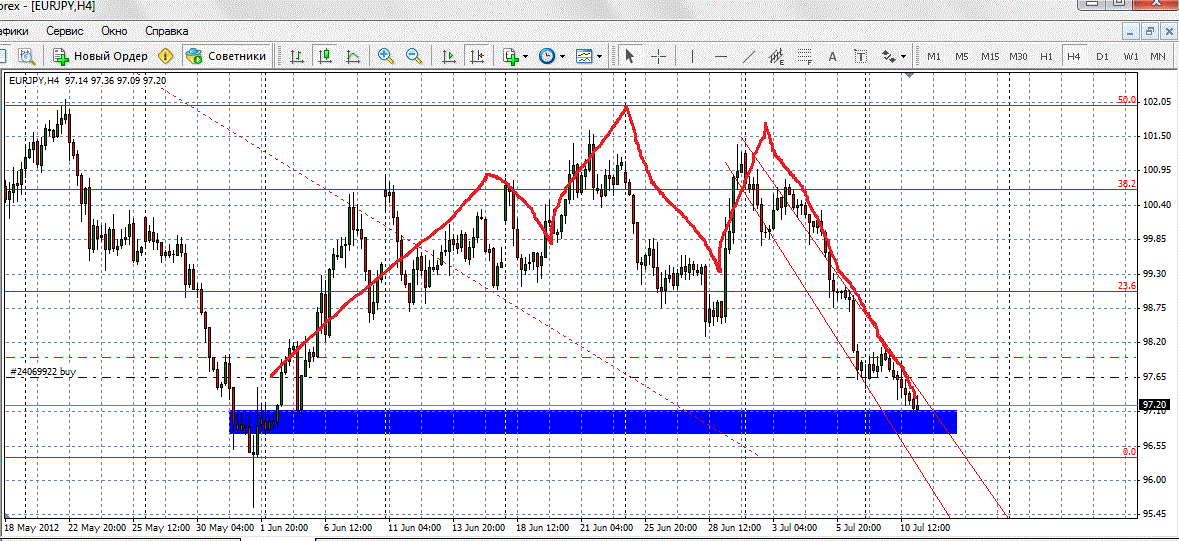 на дневном графе вроде как просматривается тройная вершина, на дневке первая волна вниз. У меня сложилось ощущение, что иену сейчас перспективно продавать, на евре по ТА бОльшая байда...