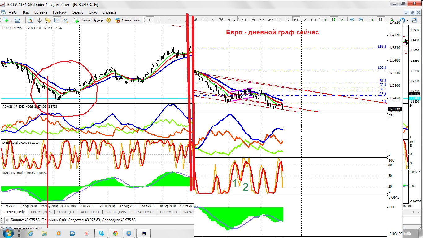 Евро/доллар Вчера отработали указатель 1.2320. Не думаю, что сейчас рванем к 1.33 сразу. Скорее всего, теперь у нас становится актуальным 1.19. Но… Торговать будущее не будем. Попробуем прочитать настоящее. А в настоящем дневка нам показывает перекупленность. НО! Какую-то вершинку на верху мы еще не взяли. Куда-то мы еще должны ткнуться, прежде чем пойти вниз. У меня выходит точка 1.2417. Ооочень знакомая! Я прямо помню, как месяц назад я ее ждала. И тогда мы так и не дотянули до нее пипсов 50, развернулись и пошли вниз. Сейчас мы до низа не дотянули пипсов 100 ). Рынок скучать не дает. Сейчас мы коснулись сильного дневного сопротивления. Видимо, поэтому и стоим. На дневке: закончилась вторая волна отрицательного движения вниз. Звонок на 1.2230 – ищем вход на покупку Прикрепленные файлы: